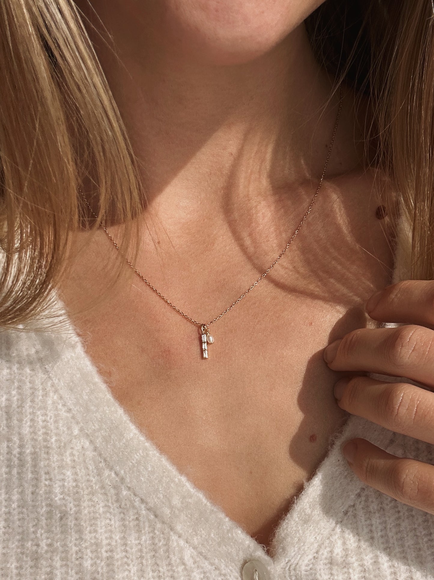 Elevate your everyday elegance with this refined Diamond Bar + Pearl Necklace. Featuring a sleek diamond bar made up of three baguette diamonds paired with a lustrous freshwater pearl, this piece captures timeless sophistication in a single, versatile design. The charming combination of geometric and organic elements creates a distinctive look that transitions seamlessly from day to evening. A charming modern classic to cherish for generations to come.