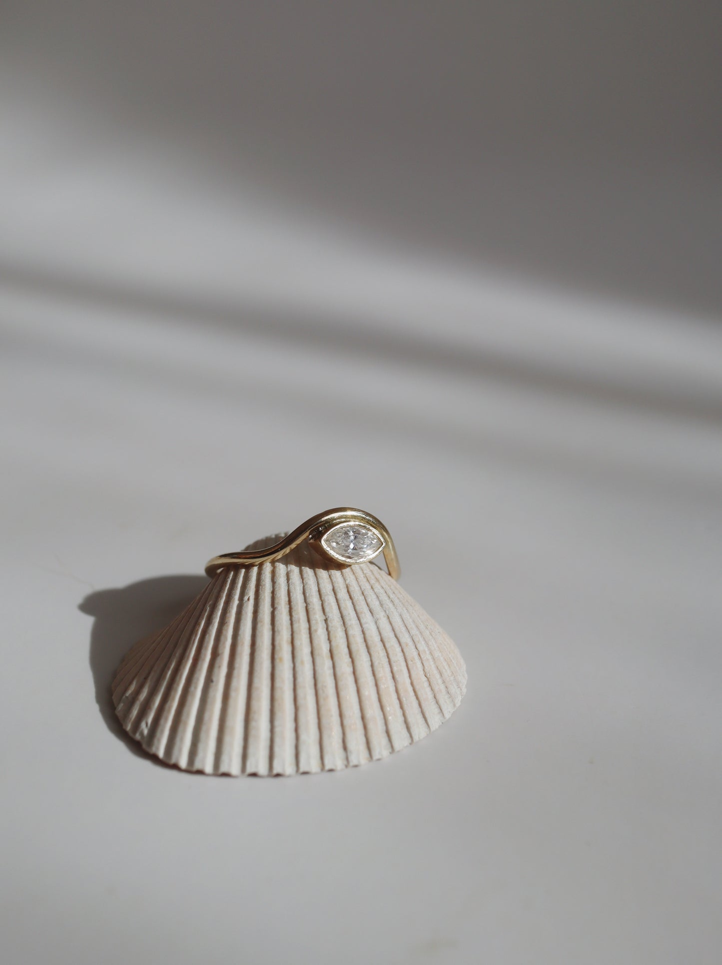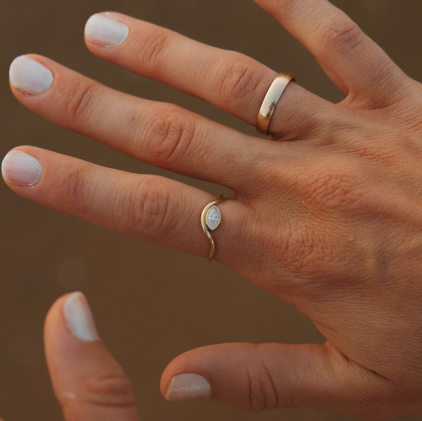 This piece features 14K Solid Gold band and a 6x3mm (.25 carat) Moissanite in a 10K Solid Gold bezel setting. It is a size 6.5 but can be sized up or down a size (anywhere from 5.5 - 7.5) if chosen below.